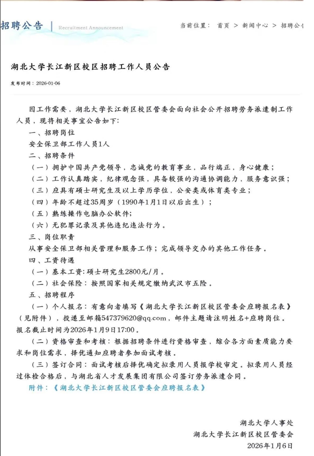 引发热议的是湖北大学人事处、湖北大学长江新区管委会于2026年1月6日发布的《湖北大学长江新区校区招聘工作人员公告》,其中提及招聘岗位为“安全保卫部工作人员1人”,要求硕士及以上学历、年龄不超过35岁、熟练操作电脑办公软件等,报名截止时间为2026年1月9日17时。由于“硕士及以上学历”与“2800元工资”形成的反差,该《招聘公告》引起了不少网友的讨论。