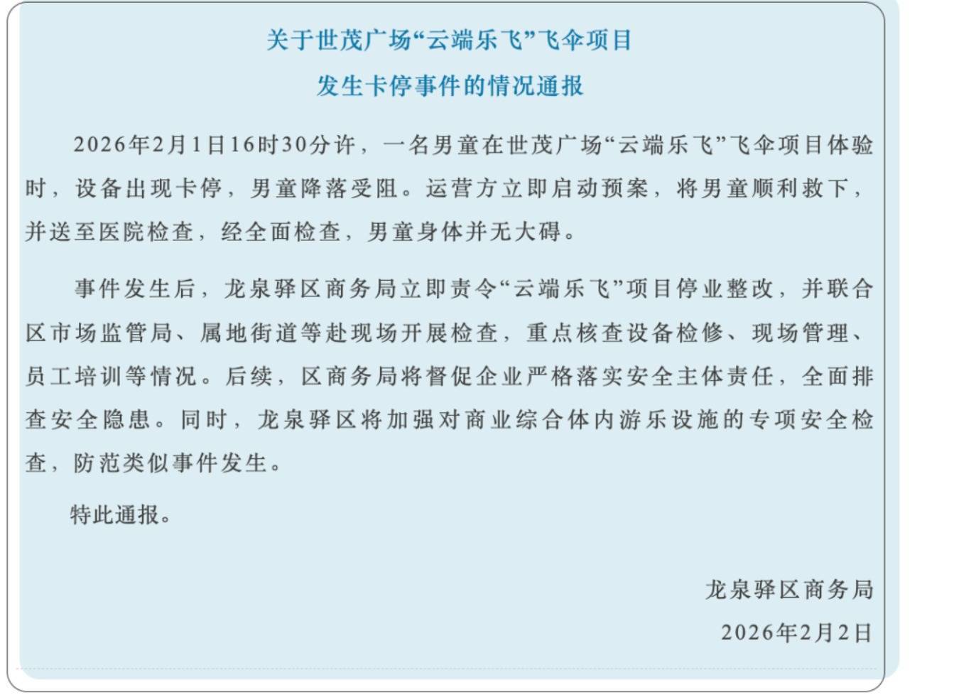2月2日,四川成都龙泉驿区商务局发布情况通报: